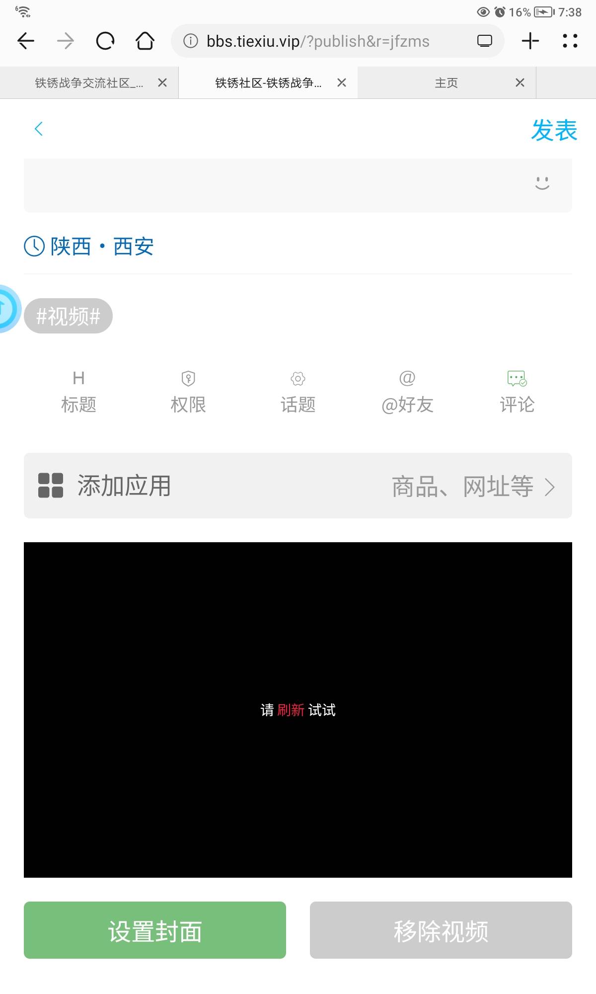 视频倒是可以发了,但是这个视频他一直显示刷新,点击刷新后没有任何效果,不知道发表出去后会不会是空白