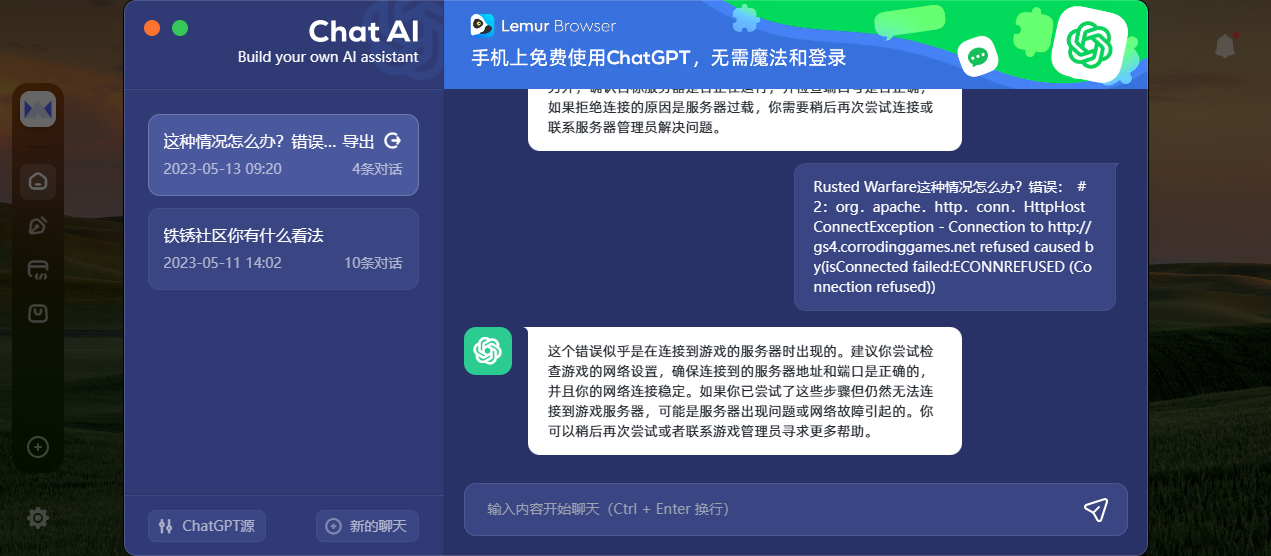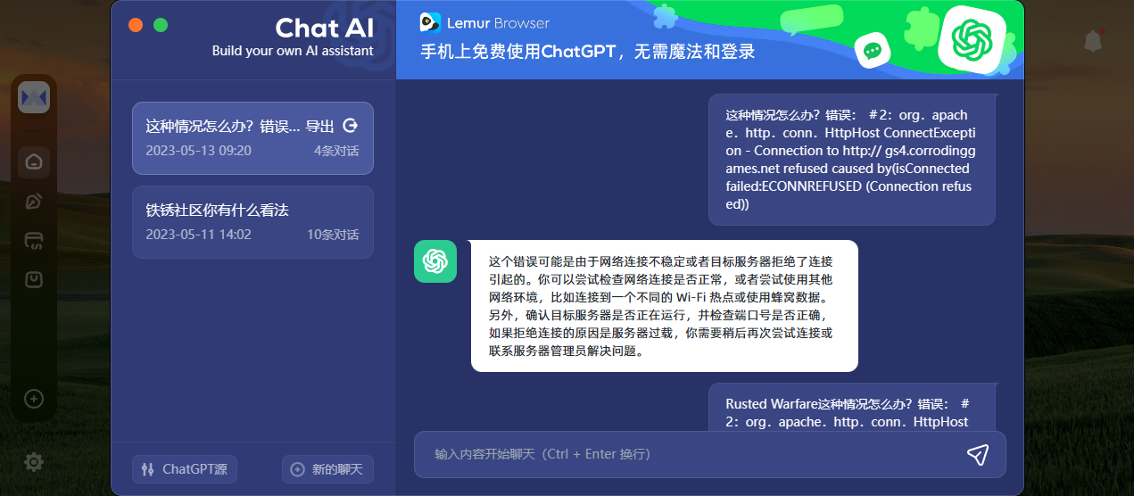 @ิۣۖิ胖ۣۖิ 链接 这种情况这个错误似乎是在连接到游戏的服务器时出现的。建议你尝试检查游戏的网络设置,确保连接到的服务器地址和端口是正确的,并且你的网络连接稳定。如果你已尝试了这些步骤但仍然无法连接到游戏服务器,可能是服务器出现问题或网络故障引起的。你可以稍后再次尝试或者联系游戏管理员寻求更多帮助。