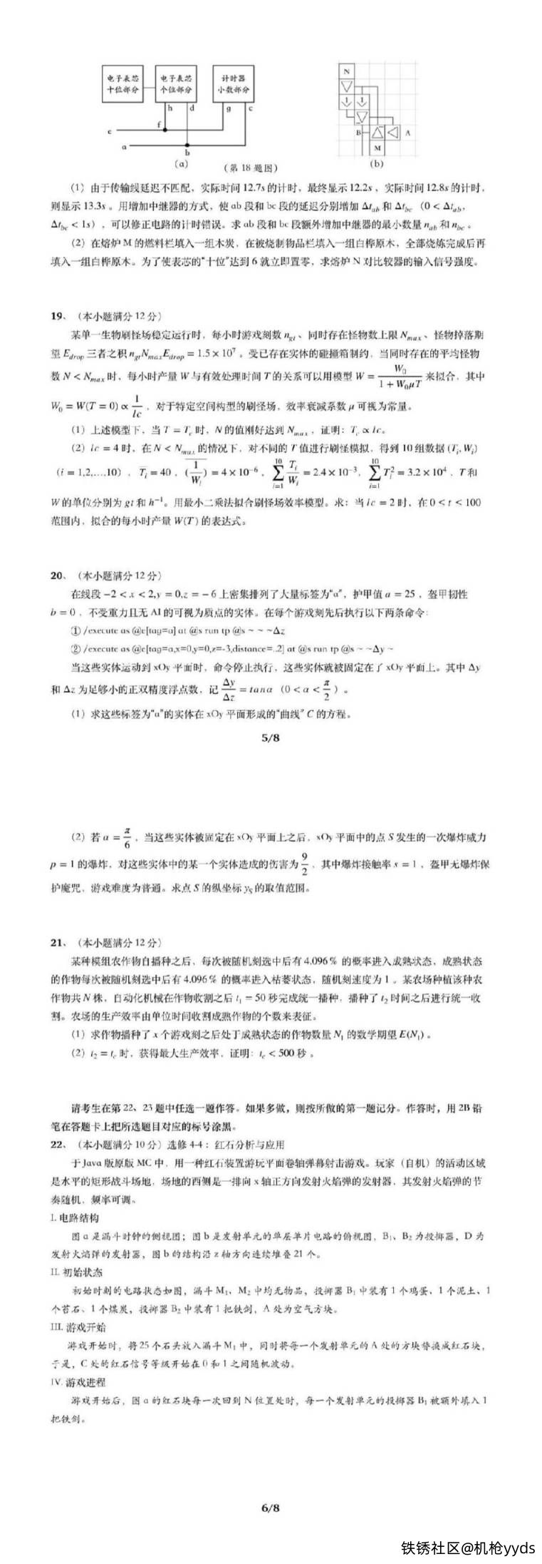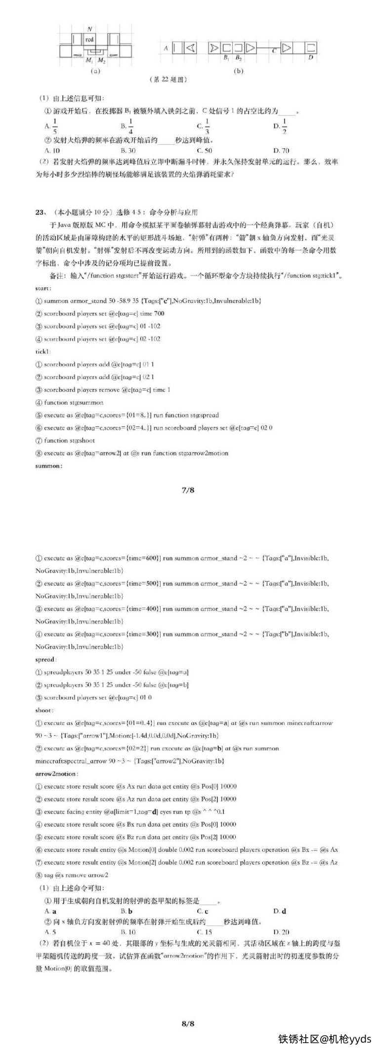 – **选考题**:第22和23题为选做题,涉及更复杂的红石电路和命令方块应用。