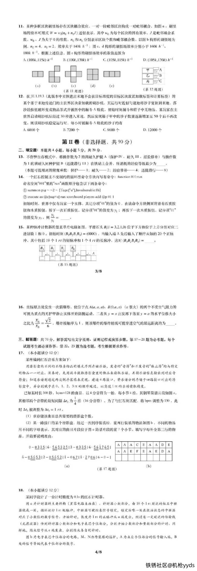 – **解答题**:第17-21题需要详细的解释和计算,如用红石编码音乐、设计计时器、模拟刷怪行为等。