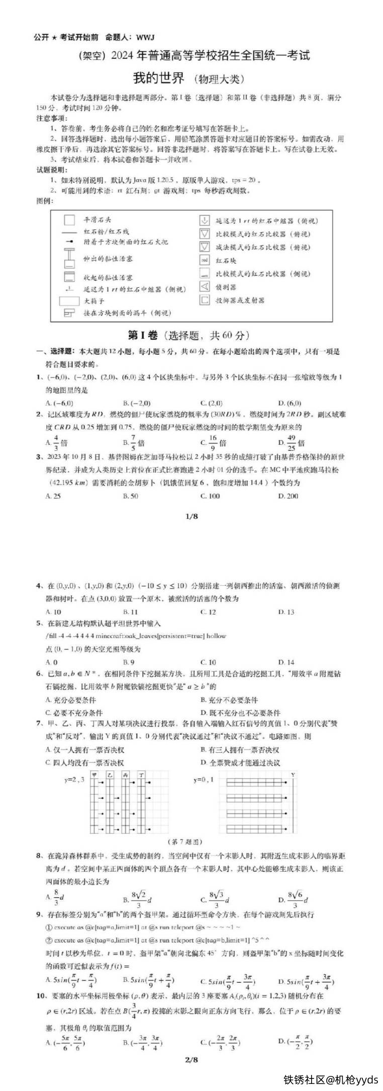 – 这份试卷将《我的世界》游戏玩法与物理和逻辑相结合,要求考生在游戏环境中应用物理概念。