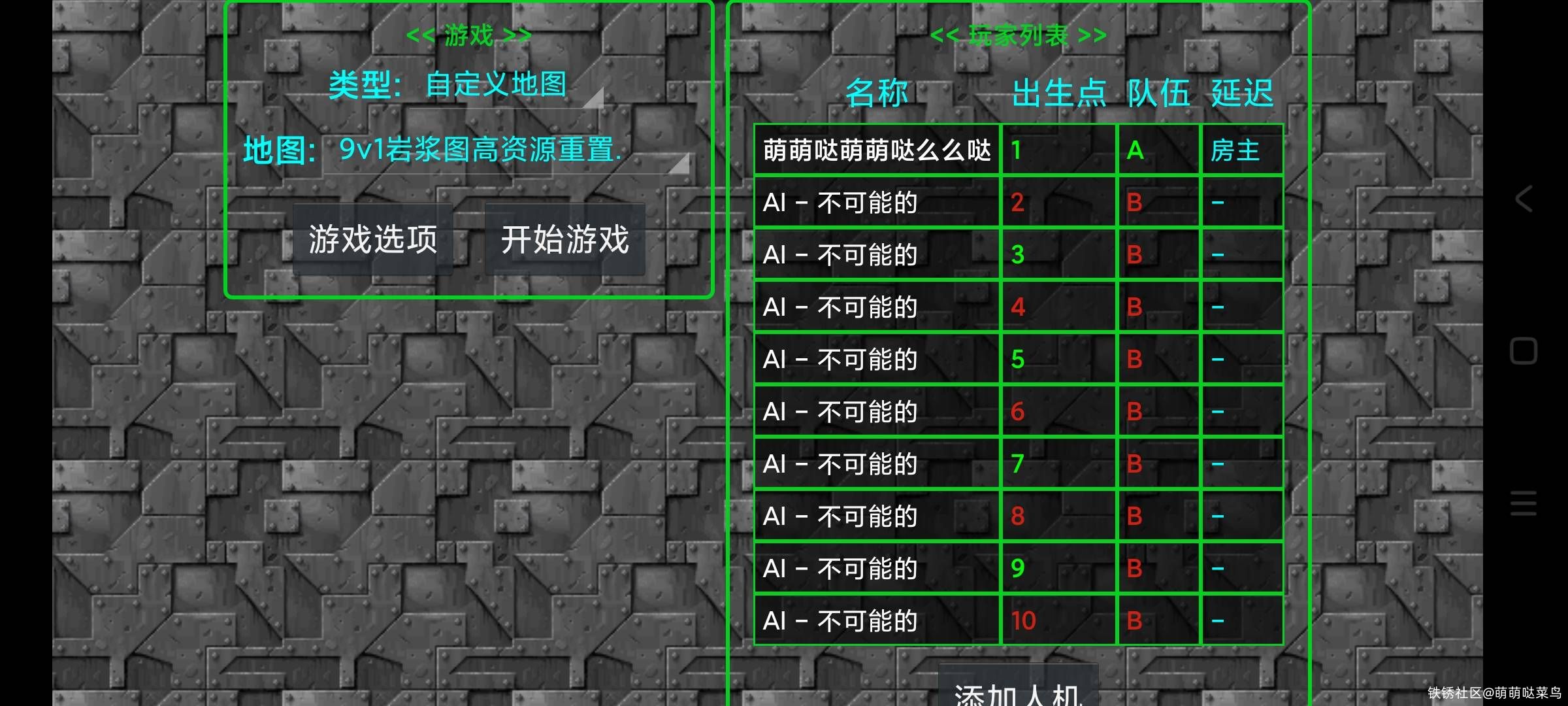 游玩方法:第1种方法:打开铁锈战争——单人战役——自定义地图——选择地图,然后高级设置,开始游玩