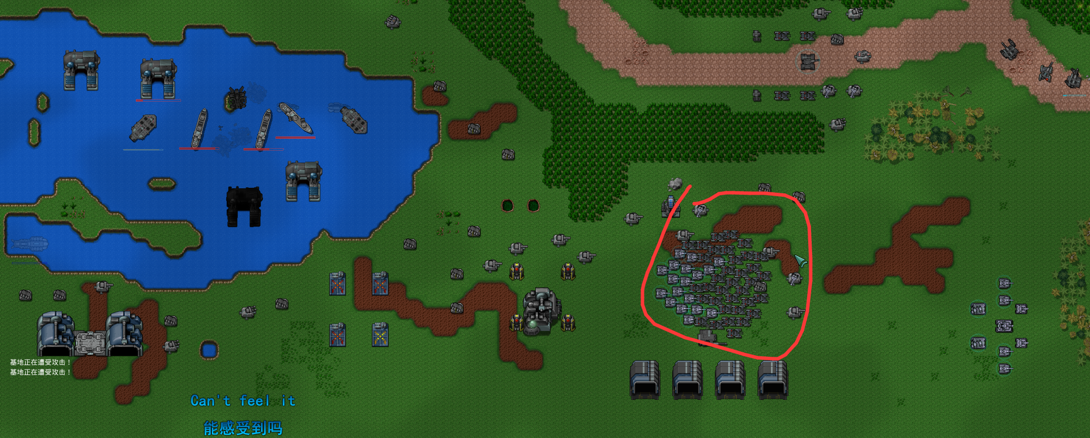 共有2个实验室,个人建议先打1号,然后以1号周围做据点耗着。(图10.11)(值得一提的是,实验室周围会定时刷兵,有导弹飞艇和等离子机甲以及喷火这种强力兵,并且实验室被打爆后会爆炸)
