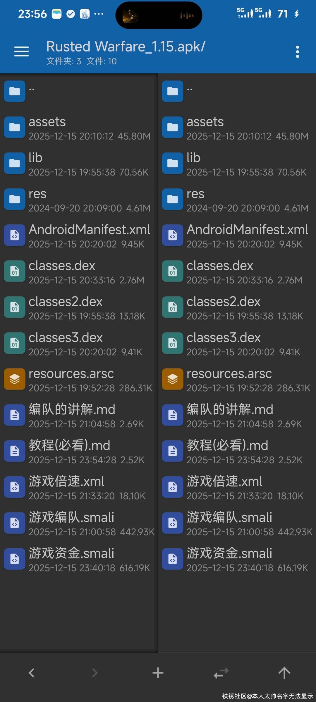 链接:https://www.123684.com/s/3OhvTd-toFWA?pwd=T8bz# 提取码:T8bz 我遇到了一个很棘手问题,这是我从谷歌商店下载的铁锈战争,没有签名校验,不管是修改任何东西他都不会闪退,我修改包名就是各种闪退,我自己无法相信一个包名我研究了三天,期间我找AI这种分析,最终以失败而告终,欢迎各路大神帮忙解决一下,这个版本我没有任何修改,就是纯原版也是最新版本