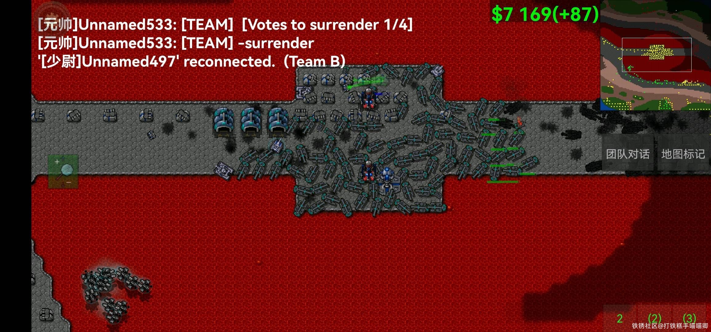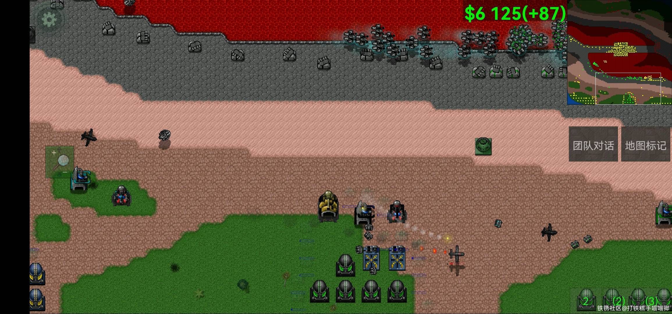 机甲位前线位都退了靠两个空军位一直拖到后面靠空投获胜,这把打的蛮激烈的,机甲位不太会玩,前期靠空投建造抢的中,后面双方抢了好几次中位,差点没守住,得亏元帅前线利用守中的钱转空爆兵勉强守下,后面一直僵持,前线和机甲就退了,后面利用元帅造的一堆空厂爆一大堆空军配合核弹突防加空堡爆兵获胜,太累力...